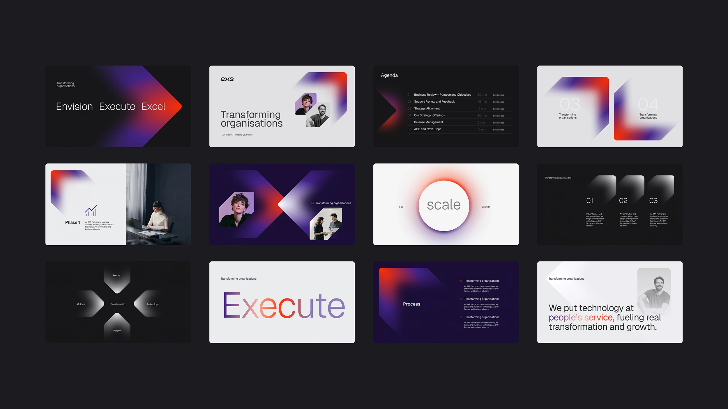 To help EX3 stand apart, we developed a brand that communicates a deliberate shift toward momentum, challenge, and human impact rather than detached expertise. EX3’s positioning is captured in two simple lines developed by Torchfish and EX3: “Putting technology in the service of people. Our mission is to enable your vision.”
